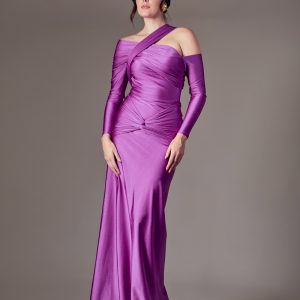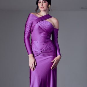 Un diseño imponente que combina sensualidad y sofisticación. Su silueta ajustada resalta la figura, mientras los cortes asimétricos y mangas largas añaden un aire moderno y elegante. Disponible en amatista y en cuero, es el vestido perfecto para impactar en galas, matrimonios o eventos donde la elegancia sea protagonista