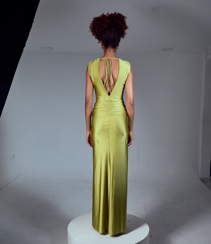 Un diseño pensado para resaltar la feminidad con sutileza. Su escote en V aporta un toque de elegancia, mientras el fruncido trasero realza la silueta con delicadeza. Disponible en verde pistacho oscuro y azul empolvado, es el vestido que combina frescura, estilo y distinción en una sola pieza