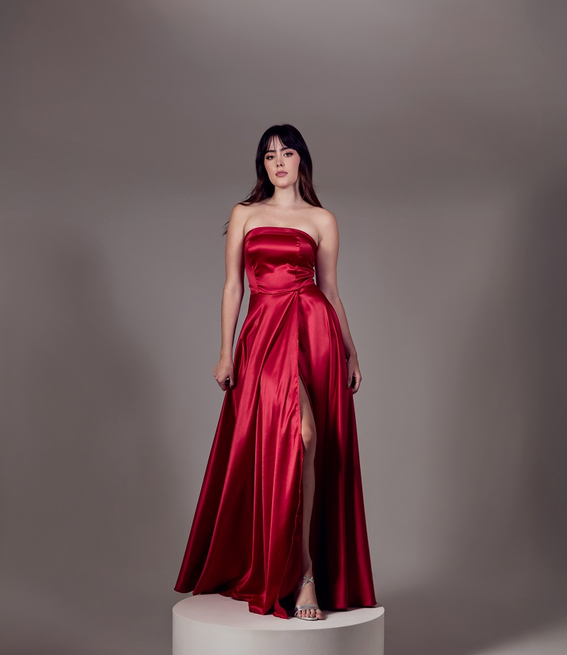 Minimalismo y sensualidad en un solo diseño. Su silueta strapless con abertura lateral crea un look audaz y sofisticado. Disponible en azul y rojo, es la prenda ideal para quienes quieren destacar con frescura y elegancia en cualquier celebración.