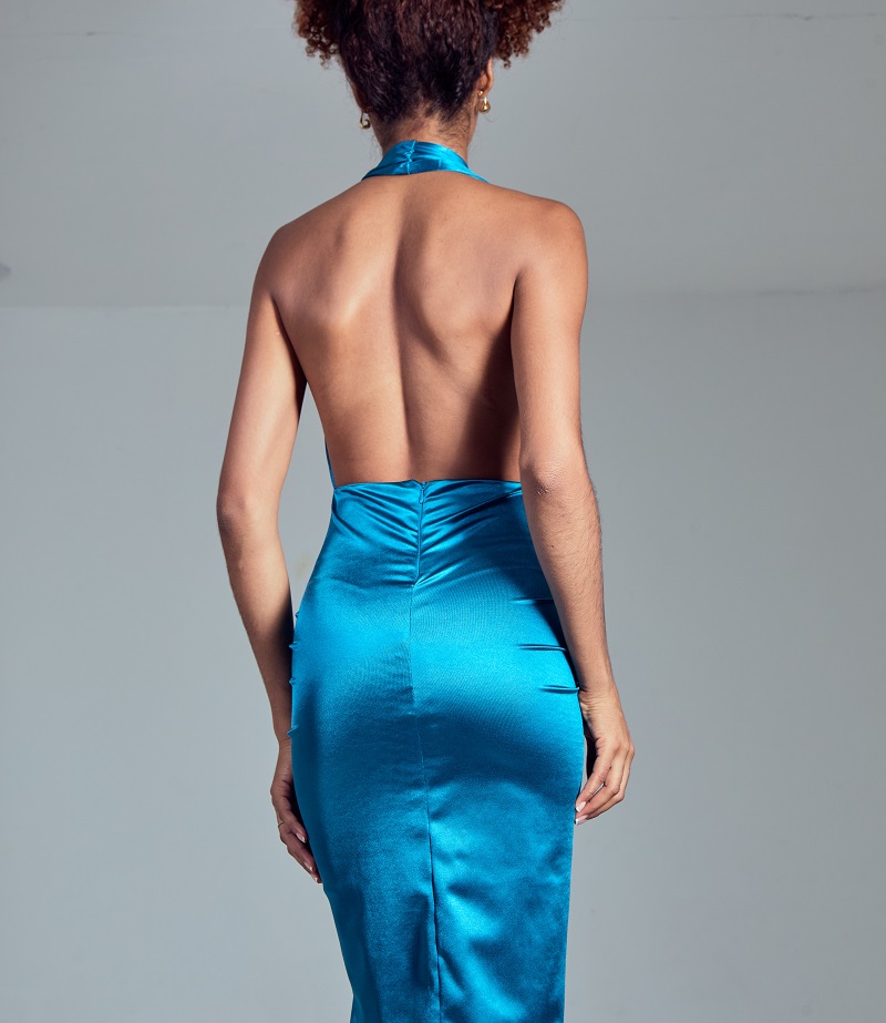 Un diseño inspirado en la frescura del verano y la elegancia del mediterráneo. Su caída fluida y el detalle de frunce lateral estilizan la silueta, logrando un look sofisticado y ligero. Disponible en amarillo y azul rey, es la elección perfecta para brillar en celebraciones al aire libre, bodas o noches que piden un toque vibrante de glamour.