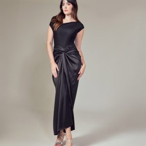 Deslumbra con elegancia moderna en este vestido largo confeccionado en suave seda. Su diseño asimétrico con manga abullonada y top cruzado aporta un toque vanguardista, mientras que la falda drapeada realza tu silueta con sofisticación. Ideal para eventos donde quieras destacar con estilo único.