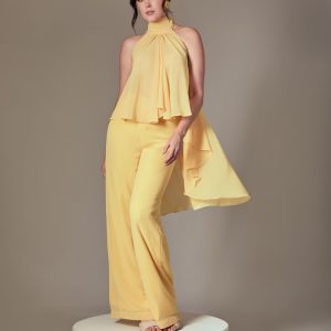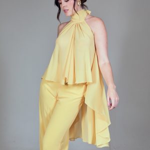 La fusión perfecta entre comodidad y elegancia. Su blusa de cuello halter con caída fluida y el pantalón de corte amplio crean un look moderno, fresco y sofisticado. Ideal para quienes buscan un estilo diferente y versátil en eventos especiales. Disponible en amarillo y coral, este conjunto es pura vitalidad y distinción.